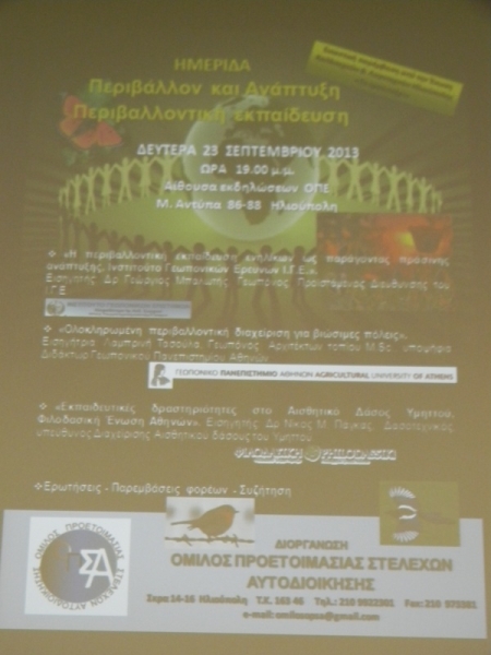 1.«Η περιβαλλοντική εκπαίδευση ενηλίκων ως παράγοντας πράσινης ανάπτυξης, Ινστιτούτο Γεωπονικών Ερευνών Ι.Γ.Ε» με εισηγητή τον Δρα Γεώργιο Μπαλωτή, Γεωπόνο, Προϊστάμενο Διεύθυνσης του Ι.Γ.Ε
