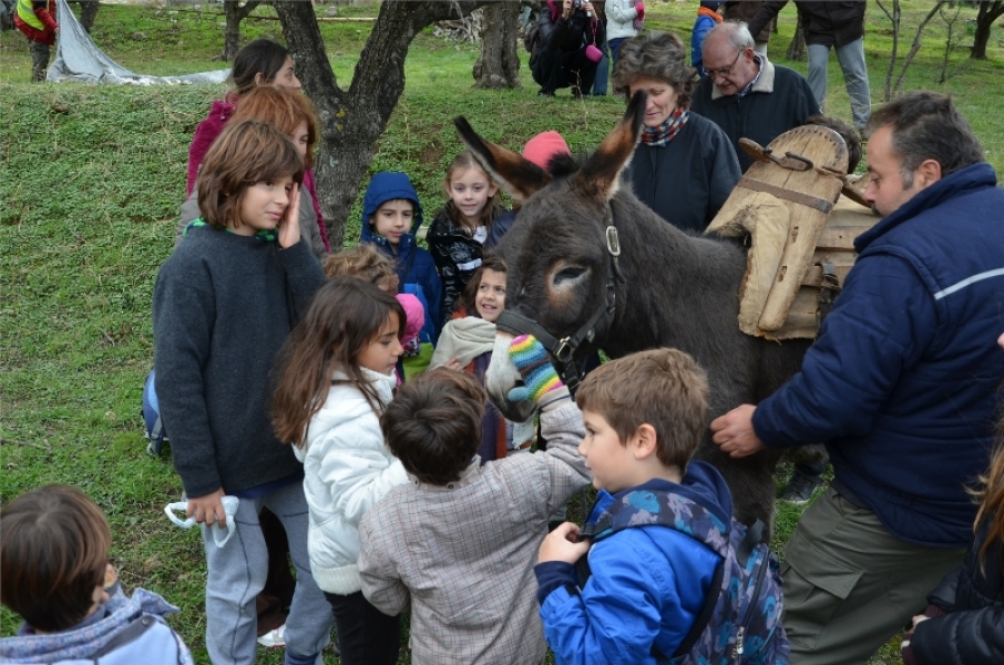 Μετά μαζεύτηκαν όλοι στην άκρη του Ελαιώνα, όπου έστρωσαν τις λινάτσες για να πέφτει ο καρπός και άρχισαν το μάζεμα και το ξεδιάλεγμα. Ύστερα ήρθε η ώρα να φορτωθούν τα σακιά στα γαϊδουράκια, που είναι και η πιο αγαπημένη ώρα για τα παιδιά. Γέμισε το βουνό γέλια και φωνές. Επιστροφή στο Μελισσοκομείο όπου προσφέρθηκαν παξιμάδια και ελιές φυσικά και ήρθε η μεγάλη στιγμή.