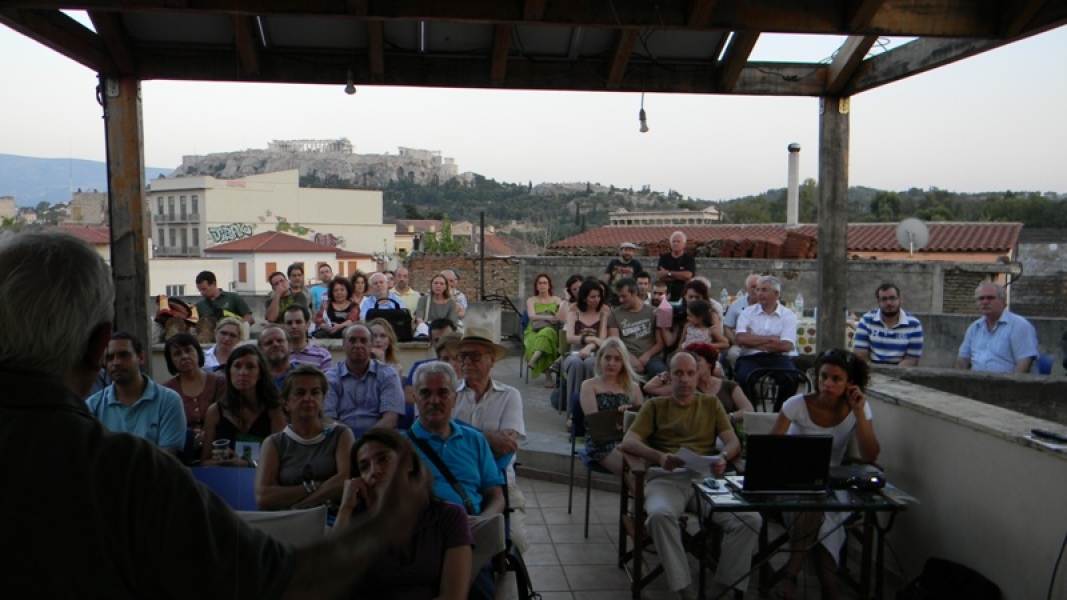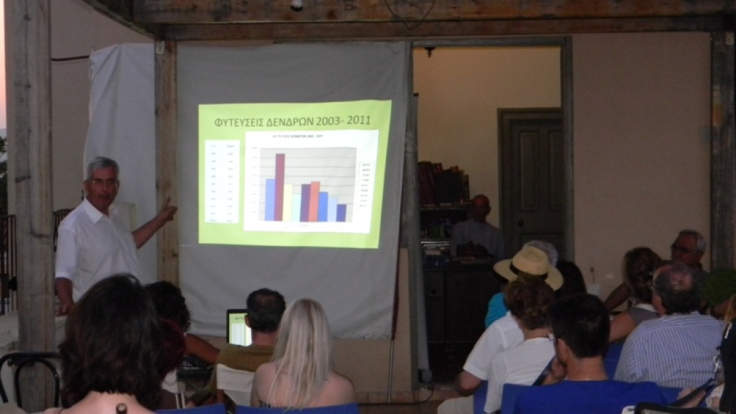 Στην πρόσκληση των τριών συνδιοργανωτών που το έτος 2010 διοργάνωσαν με μεγάλη επιτυχία εκδήλωση με θέμα «Ελληνικά Δάση και Κλιματική Αλλαγή», ανταποκρίθηκαν πολλοί φίλοι, συνεργάτες και ενδιαφερόμενοι από Δημόσιες και Δημοτικές Υπηρεσίες, από φορείς της εκπαίδευσης και της έρευνας, επαγγελματίες που σχετίζονται με το αντικείμενο, φοιτητές και άλλοι ενδιαφερόμενοι από το φάσμα των ενασχολουμένων με το περιβάλλον. Οι προσκεκλημένοι γέμισαν το φιλόξενο αίθριο της Ευωνύμου Βιβλιοθήκης με την καταπληκτική θέα προς την Ακρόπολη, το Θησείο και το λόφο του Αστεροσκοπείου αργά το απόγευμα. Ο οικοδεσπότης είχε την θαυμάσια και πρωτότυπη ιδέα να διανθίσει το χρόνο μεταξύ των ομιλιών με την παρουσίαση των σταδιακά φωταγωγούμενων μνημείων (ενώ έπεφτε το σκοτάδι) και με την ανάγνωση αποσπασμάτων σχετικών με το θέμα από το αρχείο της πλούσιας Ευωνύμου Βιβλιοθήκης.