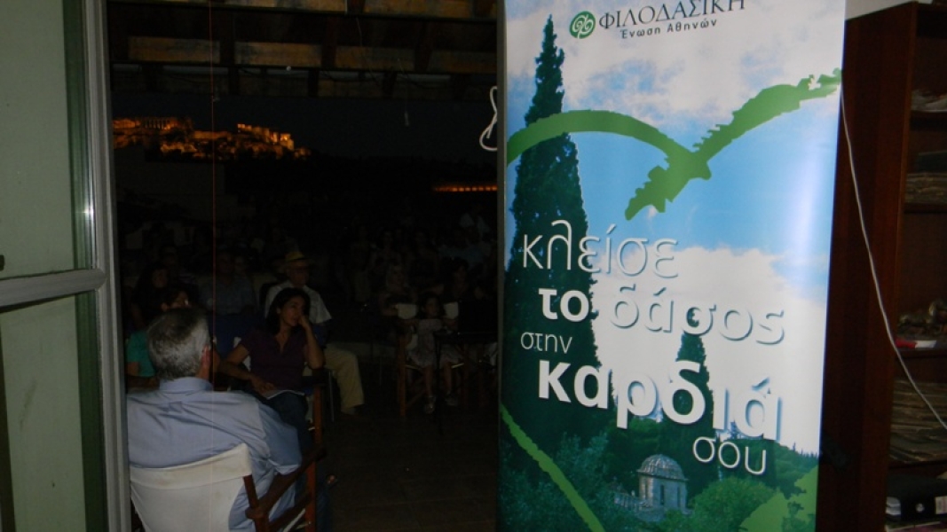 Στην πρόσκληση των τριών συνδιοργανωτών που το έτος 2010 διοργάνωσαν με μεγάλη επιτυχία εκδήλωση με θέμα «Ελληνικά Δάση και Κλιματική Αλλαγή», ανταποκρίθηκαν πολλοί φίλοι, συνεργάτες και ενδιαφερόμενοι από Δημόσιες και Δημοτικές Υπηρεσίες, από φορείς της εκπαίδευσης και της έρευνας, επαγγελματίες που σχετίζονται με το αντικείμενο, φοιτητές και άλλοι ενδιαφερόμενοι από το φάσμα των ενασχολουμένων με το περιβάλλον. Οι προσκεκλημένοι γέμισαν το φιλόξενο αίθριο της Ευωνύμου Βιβλιοθήκης με την καταπληκτική θέα προς την Ακρόπολη, το Θησείο και το λόφο του Αστεροσκοπείου αργά το απόγευμα. Ο οικοδεσπότης είχε την θαυμάσια και πρωτότυπη ιδέα να διανθίσει το χρόνο μεταξύ των ομιλιών με την παρουσίαση των σταδιακά φωταγωγούμενων μνημείων (ενώ έπεφτε το σκοτάδι) και με την ανάγνωση αποσπασμάτων σχετικών με το θέμα από το αρχείο της πλούσιας Ευωνύμου Βιβλιοθήκης.